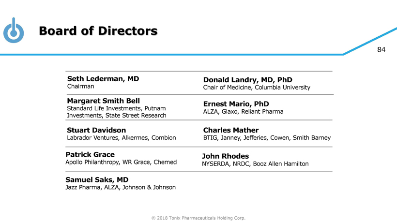 © 2018 Tonix Pharmaceuticals Holding Corp. 83 Management Team Seth Lederman, MD President & CEO Jessica Morris Chief Operating Officer Gregory Sullivan, MD Chief Medical Officer Bradley Saenger, CPA Chief Financial Officer