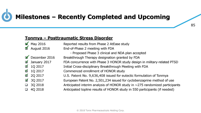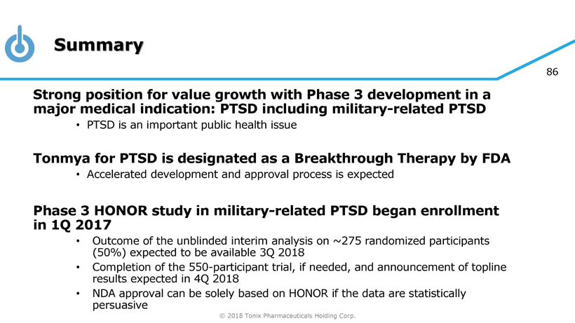 © 2018 Tonix Pharmaceuticals Holding Corp. 85 Milestones – Recently Completed and Upcoming T onmya – Posttraumatic Stress Disorder □ May 2016 Report ed results from Phase 2 AtEase study □ August 2016 End - of - Phase 2 meeting with FDA - Proposed Phase 3 clinical and NDA plan accepted □ December 201 6 Breakthrough Therapy designation granted by FDA □ January 201 7 FDA concurrence with Phase 3 HONOR study design in military - related PTSD □ 1Q 2017 Initial Cross - disciplinary Breakthrough Meeting with FDA □ 1Q 2017 Commenced enrollment of HONOR study □ 2 Q 2017 U.S. Patent No. 9,636,408 issued for eutectic formulation of Tonmya □ 3 Q 2017 European Patent No. 2,501,234 issued for cyclobenzaprine method of use □ 3Q 201 8 Anticipated interim analysis of HONOR study in ~ 275 randomized participants □ 4Q 201 8 Anticipated topline results of HONOR study in 550 participants (if needed) x x x x x x x x