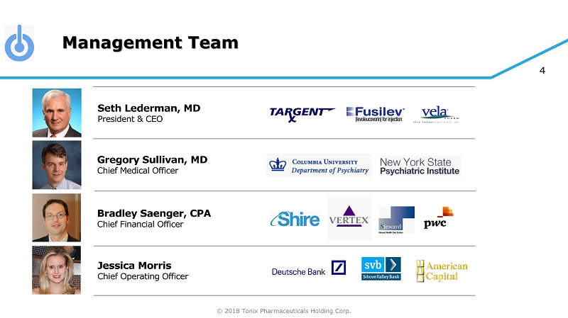 © 2018 Tonix Pharmaceuticals Holding Corp. 3 Lead Program Tonmya ®1 - FDA Breakthrough Therapy in PTSD 2 • Phase 3 HONOR study enrolling - bedtime treatment for PTSD TNX - 102 SL 3 - Bedtime treatment for agitation in Alzheimer’s disease • Phase 2 IND submitted in March 2018 TNX - 601 4 - Pre - IND candidate for daytime treatment for PTSD • Nonclinical development ongoing TNX - 801 5 - Smallpox - preventing vaccine candidate • Efficacy demonstrated in mice model • cGMP process development underway 1 Tonmya has been conditionally accepted by the U.S. FDA as the proposed trade name for TNX - 102 SL (cyclobenzaprine HCl sublingual tablets) for PTSD. Tonmya is an investigational new drug and has not been approved for any indication. 2 PTSD = Posttraumatic stress disorder 3 TNX - 102 SL is an investigational new drug and has not been approved for any indication. 4 T ianeptine oxalate 5 S ynthesized live horsepox virus Tonix Development Highlights Cyclobenzaprine Sublingual Tablets Pipeline
