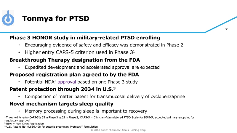 © 2018 Tonix Pharmaceuticals Holding Corp. 6 Candidates in Development Preclinical Phase 2 NDA 1 /BLA 2 Market Pipeline Product Indication/ Description Phase 3 Tonmya Bedtime Treatment for PTSD Daytime Treatment for PTSD TNX - 601 Novel polymorph and salt discovered and characterized TNX - 801 Horsepox virus synthesized and demonstrated protective vaccine activity in mice Smallpox - preventing vaccine Cyclobenzaprine HCl sublingual tablets Tianeptine oxalate oral formulation Live horsepox virus (HPXV) vaccine from cell culture Phase 1 Phase 3 – Interim Analysis 3Q2018 Full Study Topline – 4Q2018 1 NDA - New Drug Application; 2 BLA – Biologic Licensing Application; 3 Investigational New Drug Application Bedtime Treatment for Agitation in Alzheimer’s Cyclobenzaprine HCl sublingual tablets Phase 2 IND submitted 1Q2018 TNX - 102 SL All programs owned outright with no royalties or other obligations due