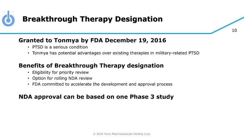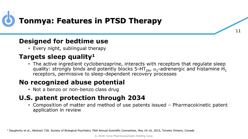© 2018 Tonix Pharmaceuticals Holding Corp. 10 Breakthrough Therapy Designation Granted to Tonmya by FDA December 19, 2016 • PTSD is a serious condition • Tonmya has potential advantages over existing therapies in military - related PTSD Benefits of Breakthrough Therapy designation • Eligibility for priority review • Option for rolling NDA review • FDA committed to accelerate the development and approval process NDA approval can be based on one Phase 3 study