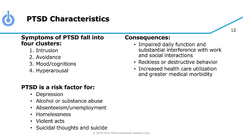 © 2018 Tonix Pharmaceuticals Holding Corp. 11 Tonmya: Features in PTSD Therapy Designed for bedtime use • Every night, sublingual therapy Targets sleep quality 1 • The active ingredient cyclobenzaprine, interacts with receptors that regulate sleep quality: strongly binds and potently blocks 5 - HT 2A , a 1 - adrenergic and histamine H 1 receptors, permissive to sleep - dependent recovery processes No recognized abuse potential • Not a benzo or non - benzo class drug U.S. patent protection through 2034 • Composition of matter and method of use patents issued – Pharmacokinetic patent application in review 1 Daugherty et al., Abstract 728, Society of Biological Psychiatry 70th Annual Scientific Convention, May 14 - 16, 2015, Toronto On tario, Canada
