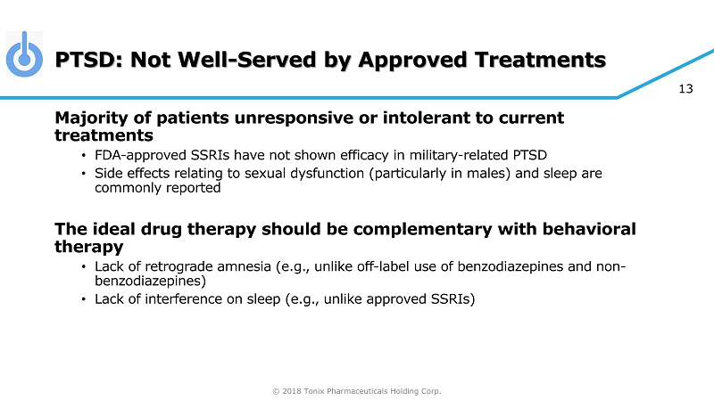 © 2018 Tonix Pharmaceuticals Holding Corp. 12 PTSD Characteristics Symptoms of PTSD fall into four clusters: 1. Intrusion 2. Avoidance 3. Mood/cognitions 4. Hyperarousal PTSD is a risk factor for: • Depression • Alcohol or substance abuse • Absenteeism/unemployment • Homelessness • Violent acts • Suicidal thoughts and suicide Consequences: • Impaired daily function and substantial interference with work and social interactions • Reckless or destructive behavior • Increased health care utilization and greater medical morbidity