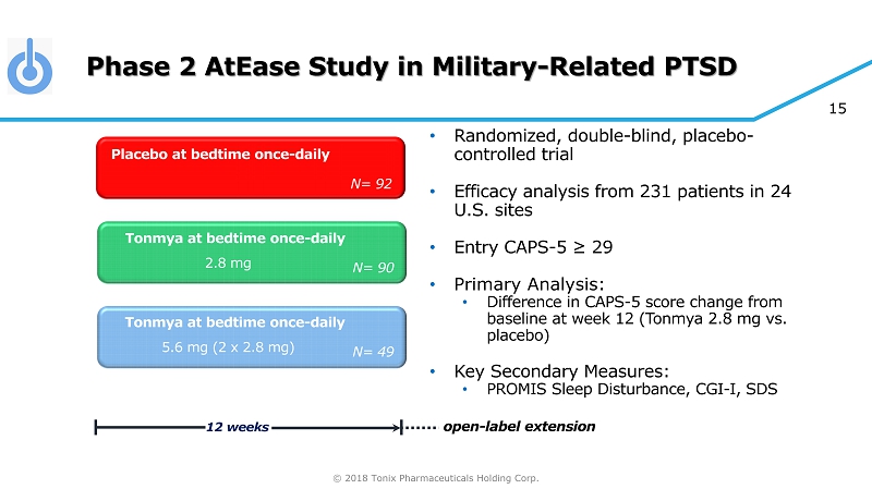 © 2018 Tonix Pharmaceuticals Holding Corp. 14 High Prevalence of PTSD Among Combat Veterans 1 Kessler et al., Arch Gen Psych 2005; Prevalence rate of 3.5% applied to U.S. Census estimate of 247M U.S. adult ( > 18) population in 2015 ( www.census.gov/quickfacts/table/PST045215/00 ) ; 2 Norris, PTSD Res Quar . 2013; 3 Analysis of VA Health Care Utilization among Operation Enduring Freedom, Operation Iraqi Freedom, and Operation New Dawn Veterans, from 1st Qtr FY 2002 through 2nd Qtr FY 2015, Washington, DC ; Among 1.9M separated OEF/OIF/OND veterans, 1.2M have obtained VA healthcare; 685k evaluated by VA with possible mental disorder, and 379k diagnosed with PTSD. >19% Operation Enduring Freedom (OEF; Afghanistan) / Operation Iraqi Freedom (OIF) veterans / Operation New Dawn (OND) 3 3 - 9% General population 1 19 - 31% Vietnam veterans 2 8.6 million American adults affected 1 Women more likely to develop than men 1 Susceptibility may run in families 1