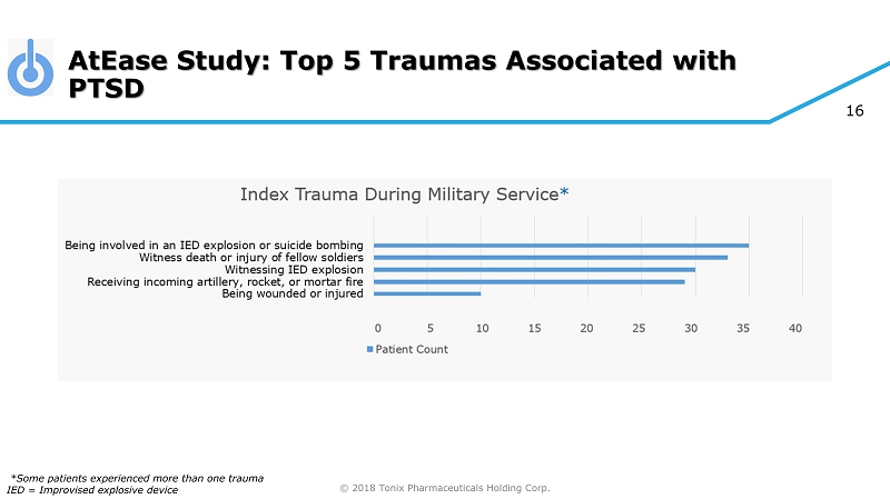© 2018 Tonix Pharmaceuticals Holding Corp. 16 AtEase Study: Top 5 Traumas Associated with PTSD *Some patients experienced more than one trauma IED = Improvised explosive device