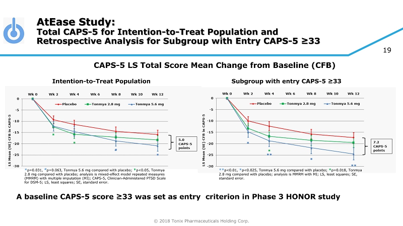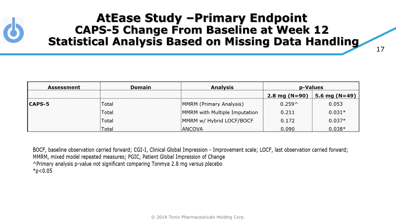 © 2018 Tonix Pharmaceuticals Holding Corp. 17 AtEase Study – Primary Endpoint CAPS - 5 Change From Baseline at Week 12 Statistical Analysis Based on Missing Data Handling