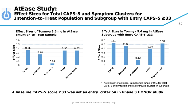 © 2018 Tonix Pharmaceuticals Holding Corp. 19 AtEase Study: Total CAPS - 5 for Intention - to - Treat Population and Retrospective Analysis for Subgroup with Entry CAPS - 5 ≥33 A baseline CAPS - 5 score ≥33 was set as entry criterion in Phase 3 HONOR study Intention - to - Treat Population Subgroup with entry CAPS - 5 ≥33 CAPS - 5 LS Total Score Mean Change from Baseline (CFB) * p=0.031, # p=0.063, Tonmya 5.6 mg compared with placebo; * p<0.05, Tonmya 2.8 mg compared with placebo; analysis is mixed - effect model repeated measures ( MMRM) with multiple imputation (MI) ; CAPS - 5, Clinician - Administered PTSD Scale for DSM - 5; LS, least squares; SE, standard error. ** p<0.01, * p<0.025, Tonmya 5.6 mg compared with placebo; * p=0.018, Tonmya 2.8 mg compared with placebo; analysis is MMRM with MI ; LS, least squares; SE, standard error.