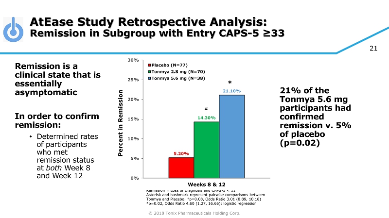© 2018 Tonix Pharmaceuticals Holding Corp. 20 0.53 0.46 0.12 0.39 0.52 0 0.1 0.2 0.3 0.4 0.5 0.6 Effect Size AtEase Study: Effect Sizes for Total CAPS - 5 and Symptom Clusters for Intention - to - Treat Population and Subgroup with Entry CAPS - 5 ≥33 Effect Sizes in Tonmya 5.6 mg in AtEase Subgroup with Entry CAPS - 5 ≥33 0.36 0.26 0.04 0.35 0.35 0 0.1 0.2 0.3 0.4 0.5 0.6 Effect Size Effect Sizes of Tonmya 5.6 mg in AtEase Intention - to - Treat Sample ▪ Note larger effect sizes, in moderate range of 0.5, for total CAPS - 5 and intrusion and hyperarousal clusters in subgroup A baseline CAPS - 5 score ≥33 was set as entry criterion in Phase 3 HONOR study
