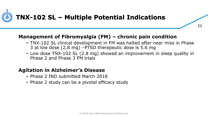 © 2018 Tonix Pharmaceuticals Holding Corp. 21 AtEase Study Retrospective Analysis: Remission in Subgroup with Entry CAPS - 5 ≥33 Remission = Loss of Diagnosis and CAPS - 5 < 11 Asterisk and hashmark represent pairwise comparisons between Tonmya and Placebo; # p=0.08, Odds Ratio 3.01 (0.89, 10.18) *p=0.02, Odds Ratio 4.60 (1.27, 16.66); logistic regression Remission is a clinical state that is essentially asymptomatic In order to confirm remission: • Determined rates of participants who met remission status at both Week 8 and Week 12 5.20% 14.30% 21.10% 0% 5% 10% 15% 20% 25% 30% Weeks 8 & 12 Percent in Remission Placebo (N=77) Tonmya 2.8 mg (N=70) Tonmya 5.6 mg (N=38) # * 21% of the Tonmya 5.6 mg participants had confirmed remission v. 5% of placebo (p=0.02)