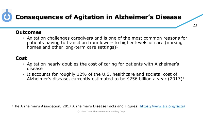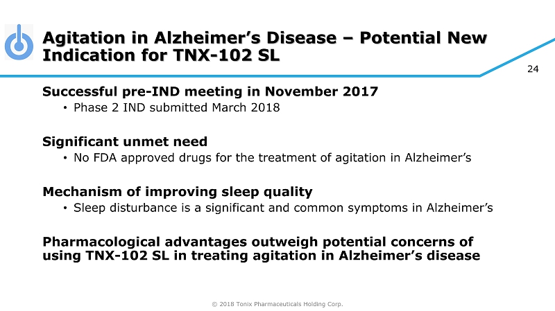 © 2018 Tonix Pharmaceuticals Holding Corp. 23 Consequences of Agitation in Alzheimer’s Disease Outcomes • Agitation challenges caregivers and is one of the most common reasons for patients having to transition from lower - to higher levels of care (nursing homes and other long - term care settings) 1 Cost • Agitation nearly doubles the cost of caring for patients with Alzheimer’s disease • It accounts for roughly 12% of the U.S. healthcare and societal cost of Alzheimer’s disease, currently estimated to be $256 billion a year (2017) 1 1 The Alzheimer’s Association, 2017 Alzheimer’s Disease Facts and Figures: https://www.alz.org/facts/