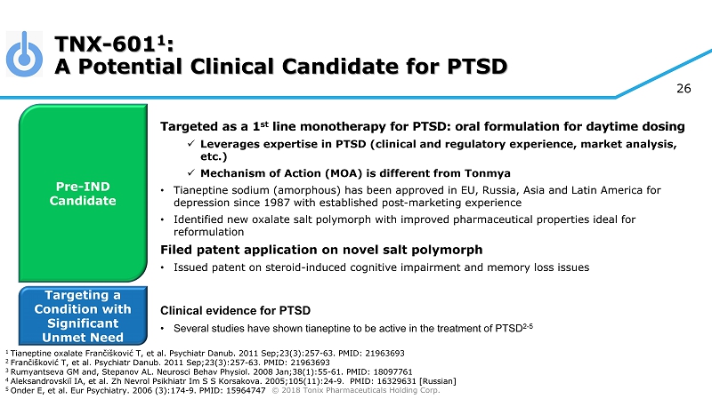 © 2018 Tonix Pharmaceuticals Holding Corp. 25 Candidates in Development Preclinical Phase 2 NDA 1 /BLA 2 Market Pipeline Product Indication/ Description Phase 3 Tonmya Bedtime Treatment for PTSD Daytime Treatment for PTSD TNX - 601 Novel polymorph and salt discovered and characterized TNX - 801 Horsepox virus synthesized and demonstrated protective vaccine activity in mice Smallpox - preventing vaccine Cyclobenzaprine HCl sublingual tablets Tianeptine oxalate oral formulation Live horsepox virus (HPXV) vaccine from cell culture Phase 1 Phase 3 – Interim Analysis 3Q2018 Full Study Topline – 4Q2018 1 NDA - New Drug Application; 2 BLA – Biologic Licensing Application; 3 Investigational New Drug Application Bedtime Treatment for Agitation in Alzheimer’s Cyclobenzaprine HCl sublingual tablets Phase 2 IND submitted 1Q2018 TNX - 102 SL All programs owned outright with no royalties or other obligations due