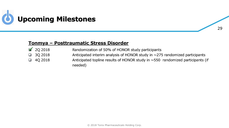 © 2018 Tonix Pharmaceuticals Holding Corp. 29 Upcoming Milestones T onmya – Posttraumatic Stress Disorder □ 2Q 2018 Randomization of 50% of HONOR study participants □ 3Q 201 8 Anticipated interim analysis of HONOR study in ~ 275 randomized participants □ 4Q 201 8 Anticipated topline results of HONOR study in ~550 randomized participants (if needed) x