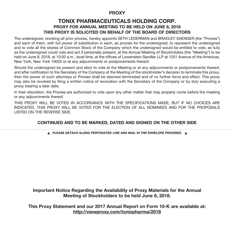 The Proxy Statement and Annual Report on Form 10-K for the year ended December 31, 2017 are available at: http://viewproxy.com/tonixpharma/2018/.