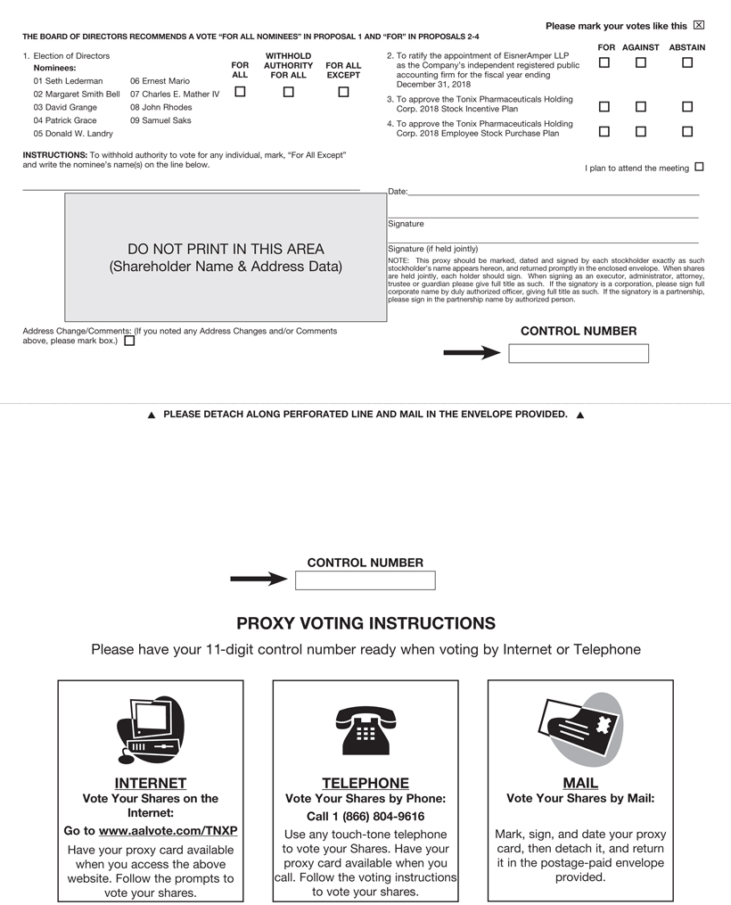 | ● | FOR approval of the Tonix Pharmaceuticals Holding Corp. 2018 Employee Stock Purchase Plan; and |
