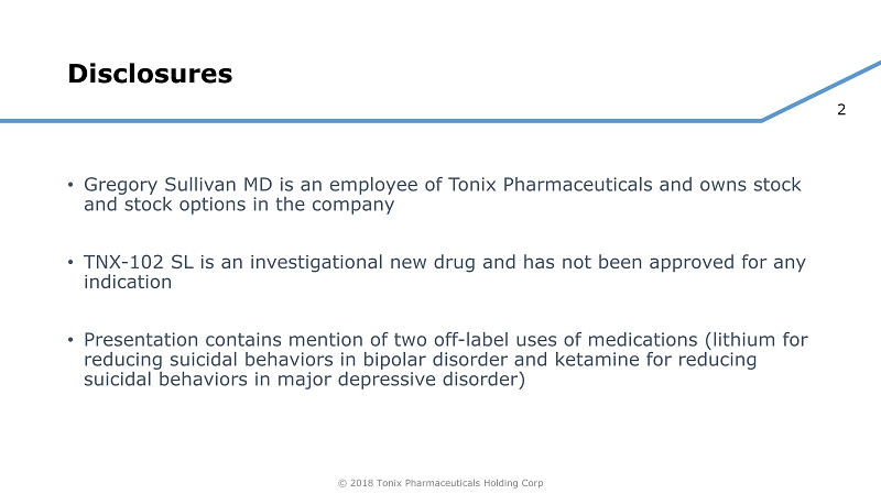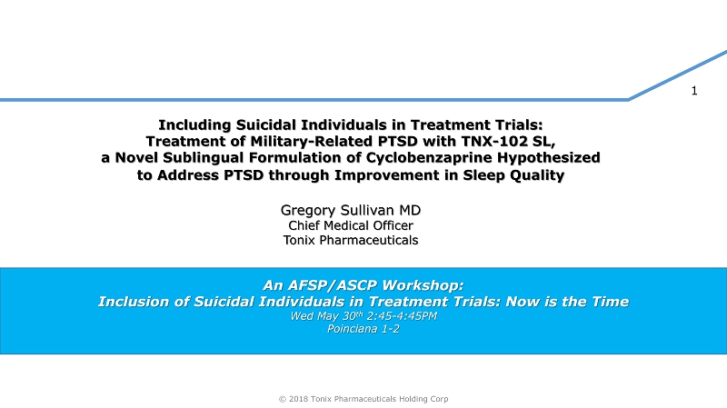 1 An AFSP/ASCP Workshop: Inclusion of Suicidal Individuals in Treatment Trials: Now is the Time Wed May 30 th 2:45 - 4:45PM Poinciana 1 - 2 © 2018 Tonix Pharmaceuticals Holding Corp Including Suicidal Individuals in Treatment Trials: Treatment of Military - Related PTSD with TNX - 102 SL, a Novel Sublingual Formulation of Cyclobenzaprine Hypothesized to Address PTSD through Improvement in Sleep Quality Gregory Sullivan MD Chief Medical Officer Tonix Pharmaceuticals