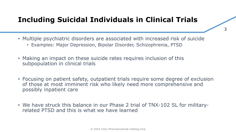 2 © 2018 Tonix Pharmaceuticals Holding Corp Disclosures • Gregory Sullivan MD is an employee of Tonix Pharmaceuticals and owns stock and stock options in the company • TNX - 102 SL is an investigational new drug and has not been approved for any indication • Presentation contains mention of two off - label uses of medications (lithium for reducing suicidal behaviors in bipolar disorder and ketamine for reducing suicidal behaviors in major depressive disorder)