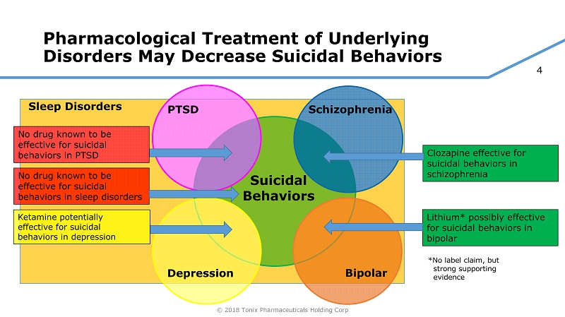 3 © 2018 Tonix Pharmaceuticals Holding Corp Including Suicidal Individuals in Clinical Trials • Multiple psychiatric disorders are associated with increased risk of suicide • Examples: Major Depression, Bipolar Disorder, Schizophrenia, PTSD • Making an impact on these suicide rates requires inclusion of this subpopulation in clinical trials • Focusing on patient safety, outpatient trials require some degree of exclusion of those at most imminent risk who likely need more comprehensive and possibly inpatient care • We have struck this balance in our Phase 2 trial of TNX - 102 SL for military - related PTSD and this is what we have learned
