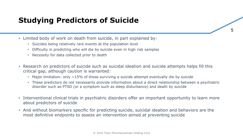 4 © 2018 Tonix Pharmaceuticals Holding Corp Pharmacological Treatment of Underlying Disorders May Decrease Suicidal Behaviors Suicidal Behaviors PTSD Depression Schizophrenia Bipolar Clozapine effective for suicidal behaviors in schizophrenia Lithium* p ossibly effective for suicidal behaviors in bipolar *No label claim, but strong supporting evidence Sleep Disorders No drug known to be effective for suicidal behaviors in PTSD Ketamine potentially effective for suicidal behaviors in depression No drug known to be effective for suicidal behaviors in sleep disorders