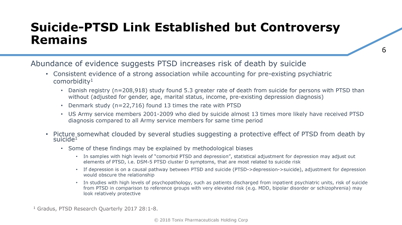 5 © 2018 Tonix Pharmaceuticals Holding Corp Studying Predictors of Suicide • Limited body of work on death from suicide, in part explained by: • Suicides being relatively rare events at the population level • Difficulty in predicting who will die by suicide even in high risk samples • Necessity for data collected prior to death • Research on predictors of suicide such as suicidal ideation and suicide attempts helps fill this critical gap, although caution is warranted: • Major limitation: only ~15% of those surviving a suicide attempt eventually die by suicide • These predictors do not necessarily provide information about a direct relationship between a psychiatric disorder such as PTSD (or a symptom such as sleep disturbance) and death by suicide • Interventional clinical trials in psychiatric disorders offer an important opportunity to learn more about predictors of suicide • And without biomarkers specific for predicting suicide, suicidal ideation and behaviors are the most definitive endpoints to assess an intervention aimed at preventing suicide