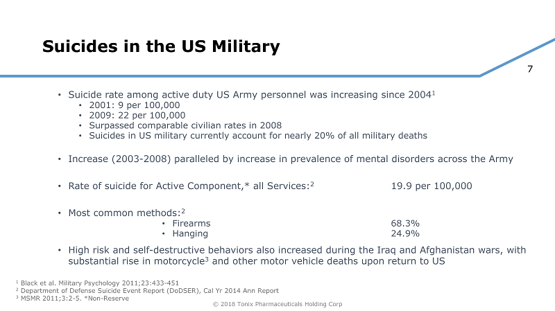 6 © 2018 Tonix Pharmaceuticals Holding Corp Suicide - PTSD Link Established but Controversy Remains Abundance of evidence suggests PTSD increases risk of death by suicide • Consistent evidence of a strong association while accounting for pre - existing psychiatric comorbidity 1 • Danish registry (n=208,918) study found 5.3 greater rate of death from suicide for persons with PTSD than without (adjusted for gender, age, marital status, income, pre - existing depression diagnosis) • Denmark study (n=22,716) found 13 times the rate with PTSD • US Army service members 2001 - 2009 who died by suicide almost 13 times more likely have received PTSD diagnosis compared to all Army service members for same time period • Picture somewhat clouded by several studies suggesting a protective effect of PTSD from death by suicide 1 • Some of these findings may be explained by methodological biases • In samples with high levels of “comorbid PTSD and depression”, statistical adjustment for depression may adjust out elements of PTSD, i.e. DSM - 5 PTSD cluster D symptoms, that are most related to suicide risk • If depression is on a causal pathway between PTSD and suicide (PTSD - >depression - >suicide), adjustment for depression would obscure the relationship • In studies with high levels of psychopathology, such as patients discharged from inpatient psychiatric units, risk of suicide from PTSD in comparison to reference groups with very elevated risk (e.g. MDD, bipolar disorder or schizophrenia) may look relatively protective 1 Gradus, PTSD Research Quarterly 2017 28:1 - 8.
