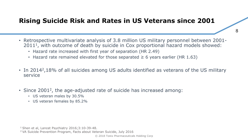 7 © 2018 Tonix Pharmaceuticals Holding Corp Suicides in the US Military • Suicide rate among active duty US Army personnel was increasing since 2004 1 • 2001: 9 per 100,000 • 2009: 22 per 100,000 • Surpassed comparable civilian rates in 2008 • Suicides in US military currently account for nearly 20% of all military deaths • Increase (2003 - 2008) paralleled by increase in prevalence of mental disorders across the Army • Rate of suicide for Active Component,* all Services: 2 19.9 per 100,000 • Most common methods: 2 • Firearms 68.3% • Hanging 24.9% • High risk and self - destructive behaviors also increased during the Iraq and Afghanistan wars, with substantial rise in motorcycle 3 and other motor vehicle deaths upon return to US 1 Black et al. Military Psychology 2011;23:433 - 451 2 Department of Defense Suicide Event Report ( DoDSER ), Cal Yr 2014 Ann Report 3 MSMR 2011;3:2 - 5. *Non - Reserve