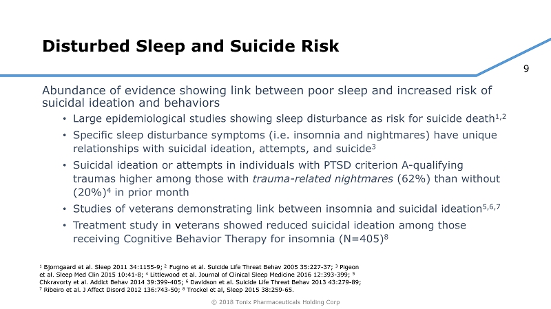8 © 2018 Tonix Pharmaceuticals Holding Corp Rising Suicide Risk and Rates in US Veterans since 2001 • Retrospective multivariate analysis of 3.8 million US military personnel between 2001 - 2011 1 , with outcome of death by suicide in Cox proportional hazard models showed: • Hazard rate increased with first year of separation (HR 2.49) • Hazard rate remained elevated for those separated ≥ 6 years earlier (HR 1.63) • In 2014 2 ,18% of all suicides among US adults identified as veterans of the US military service • Since 2001 2 , the age - adjusted rate of suicide has increased among: • US veteran males by 30.5% • US veteran females by 85.2% 1 Shen et al, Lancet Psychiatry 2016;3:10 - 39 - 48. 2 VA Suicide Prevention Program, Facts about Veteran Suicide, July 2016