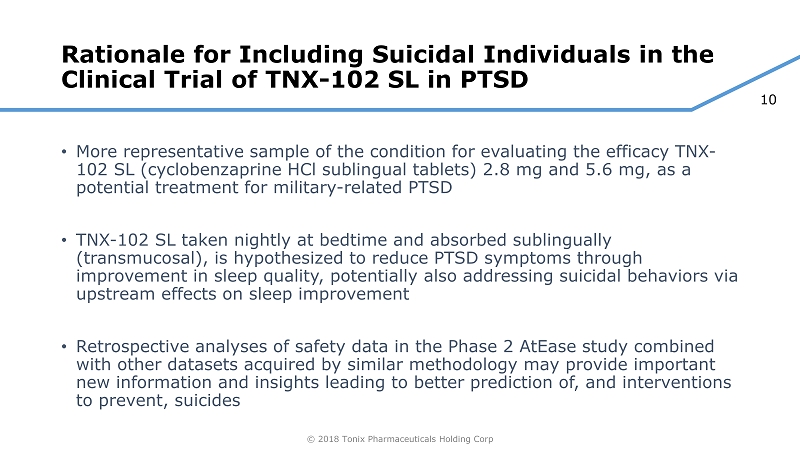 9 © 2018 Tonix Pharmaceuticals Holding Corp Disturbed Sleep and Suicide Risk Abundance of evidence showing link between poor sleep and increased risk of suicidal ideation and behaviors • Large epidemiological studies showing sleep disturbance as risk for suicide death 1,2 • Specific sleep disturbance symptoms (i.e. insomnia and nightmares) have unique relationships with suicidal ideation, attempts, and suicide 3 • Suicidal ideation or attempts in individuals with PTSD criterion A - qualifying traumas higher among those with trauma - related nightmares (62%) than without (20%) 4 in prior month • Studies of veterans demonstrating link between insomnia and suicidal ideation 5,6,7 • Treatment study in v eterans showed reduced suicidal ideation among those receiving Cognitive Behavior Therapy for insomnia (N=405) 8 1 Bjorngaard et al. Sleep 2011 34:1155 - 9; 2 Fugino et al. Suicide Life Threat Behav 2005 35:227 - 37; 3 Pigeon et al. Sleep Med Clin 2015 10:41 - 8; 4 Littlewood et al. Journal of Clinical Sleep Medicine 2016 12:393 - 399; 5 Chkravorty et al. Addict Behav 2014 39:399 - 405; 6 Davidson et al. Suicide Life Threat Behav 2013 43:279 - 89; 7 Ribeiro et al. J Affect Disord 2012 136:743 - 50; 8 Trockel et al, Sleep 2015 38:259 - 65.