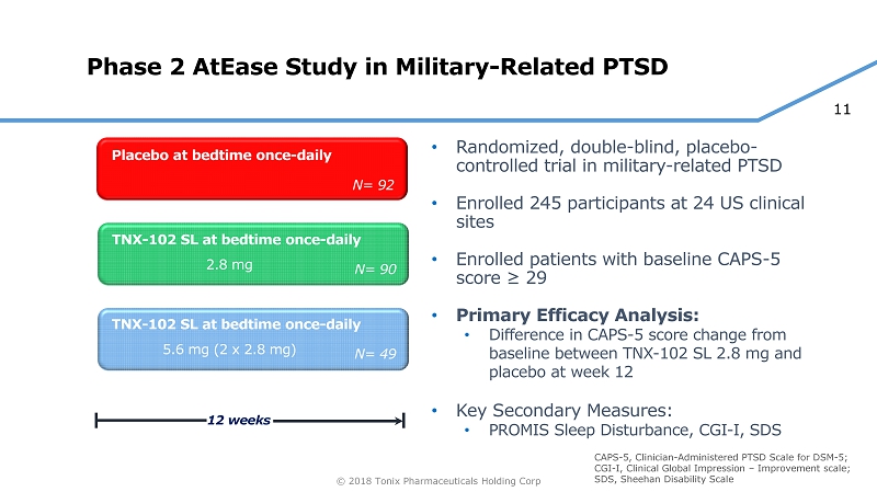 10 © 2018 Tonix Pharmaceuticals Holding Corp Rationale for Including Suicidal Individuals in the Clinical Trial of TNX - 102 SL in PTSD • More representative sample of the condition for evaluating the efficacy TNX - 102 SL (cyclobenzaprine HCl sublingual tablets) 2.8 mg and 5.6 mg, as a potential treatment for military - related PTSD • TNX - 102 SL taken nightly at bedtime and absorbed sublingually (transmucosal), is hypothesized to reduce PTSD symptoms through improvement in sleep quality, potentially also addressing suicidal behaviors via upstream effects on sleep improvement • Retrospective analyses of safety data in the Phase 2 AtEase study combined with other datasets acquired by similar methodology may provide important new information and insights leading to better prediction of, and interventions to prevent, suicides