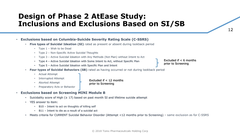 11 © 2018 Tonix Pharmaceuticals Holding Corp Phase 2 AtEase Study in Military - Related PTSD • Randomized, double - blind, placebo - controlled trial in military - related PTSD • Enrolled 245 participants at 24 US clinical sites • Enrolled patients with baseline CAPS - 5 score ≥ 29 • Primary Efficacy Analysis: • Difference in CAPS - 5 score change from baseline between TNX - 102 SL 2.8 mg and placebo at week 12 • Key Secondary Measures: • PROMIS Sleep Disturbance, CGI - I, SDS TNX - 102 SL at bedtime once - daily Placebo at bedtime once - daily 12 weeks N= 90 TNX - 102 SL at bedtime once - daily N= 92 N= 49 2.8 mg 5.6 mg (2 x 2.8 mg) CAPS - 5, Clinician - Administered PTSD Scale for DSM - 5; CGI - I, Clinical Global Impression – Improvement scale; SDS, Sheehan Disability Scale