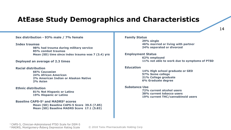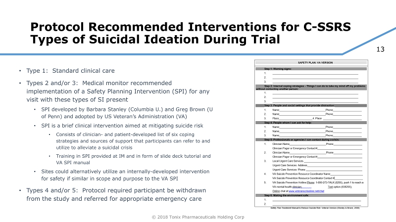 13 © 2018 Tonix Pharmaceuticals Holding Corp Protocol Recommended Interventions for C - SSRS Types of Suicidal Ideation During Trial • Type 1: Standard clinical care • Types 2 and/or 3: Medical monitor recommended implementation of a Safety Planning Intervention (SPI) for any visit with these types of SI present • SPI developed by Barbara Stanley (Columbia U.) and Greg Brown (U of Penn) and adopted by US Veteran’s Administration (VA) • SPI is a brief clinical intervention aimed at mitigating suicide risk • Consists of clinician - and patient - developed list of six coping strategies and sources of support that participants can refer to and utilize to alleviate a suicidal crisis • Training in SPI provided at IM and in form of slide deck tutorial and VA SPI manual • Sites could alternatively utilize an internally - developed intervention for safety if similar in scope and purpose to the VA SPI • Types 4 and/or 5: Protocol required participant be withdrawn from the study and referred for appropriate emergency care