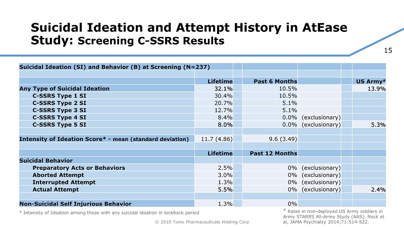 14 © 2018 Tonix Pharmaceuticals Holding Corp AtEase Study Demographics and Characteristics Sex distribution - 93% male / 7% female Index traumas 98% had trauma during military service 85% combat traumas Mean (SD) time since index trauma was 7 (3.4) yrs Deployed an average of 2.3 times Racial distribution 66% Caucasian 24% African American 2% American Indian or Alaskan Native 2% Asian Ethnic distribution 81% Not Hispanic or Latino 19% Hispanic or Latino Baseline CAPS - 5 1 and MADRS 2 scores Mean (SD) Baseline CAPS - 5 Score 39.5 (7.85) Mean (SD) Baseline MADRS Score 17.1 (5.83) Family Status 29% single 46% married or living with partner 24% separated or divorced Employment Status 62% employed 11% not able to work due to symptoms of PTSD Education 14% High school graduate or GED 57% Some college 21% College graduate 6% Graduate degree Substance Use 72% current alcohol users 38% current tobacco users 19% current THC/cannabinoid users 1 CAPS - 5, Clinician - Administered PTSD Scale for DSM - 5 2 MADRS, Montgomery - Åsberg Depression Rating Scale