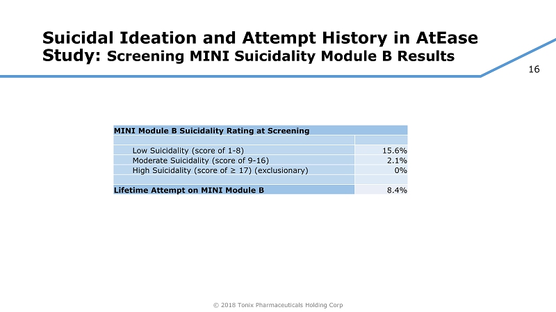 15 © 2018 Tonix Pharmaceuticals Holding Corp Suicidal Ideation and Attempt History in AtEase Study: Screening C - SSRS Results Suicidal Ideation (SI) and Behavior (B) at Screening (N=237) Lifetime Any Type of Suicidal Ideation 32.1% C - SSRS Type 1 SI 30.4% C - SSRS Type 2 SI 20.7% C - SSRS Type 3 SI 12.7% C - SSRS Type 4 SI 8.4% C - SSRS Type 5 SI 8.0% Intensity of Ideation Score* - mean (standard deviation) 11.7 (4.86) Lifetime Suicidal Behavior Preparatory Acts or Behaviors 2.5% Aborted Attempt 3.0% Interrupted Attempt 1.3% Actual Attempt 5.5% Non - Suicidal Self Injurious Behavior 1.3% Past 6 Months 10.5% 10.5% 5.1% 5.1% 0.0% (exclusionary) 0.0% (exclusionary) 9.6 (3.49) Past 12 Months 0% (exclusionary) 0% (exclusionary) 0% (exclusionary) 0% (exclusionary) 0% US Army # 13.9% 5.3% 2.4% * Intensity of Ideation among those with any suicidal ideation in lookback period # Rates in non - deployed US Army soldiers in Army STARRS All - Army Study (AAS). Nock et al, JAMA Psychiatry 2014;71:514 - 522.