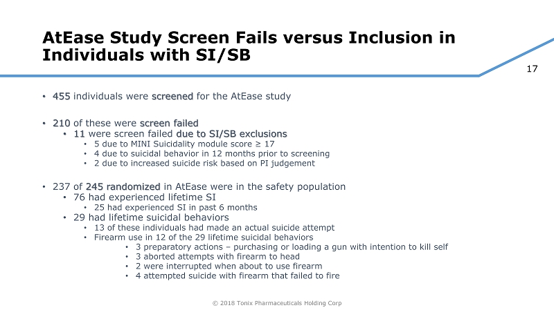 16 © 2018 Tonix Pharmaceuticals Holding Corp Suicidal Ideation and Attempt History in AtEase Study: Screening MINI Suicidality Module B Results MINI Module B Suicidality Rating at Screening Low Suicidality (score of 1 - 8) 15.6% Moderate Suicidality (score of 9 - 16) 2.1% High Suicidality (score of ≥ 17) (exclusionary) 0% Lifetime Attempt on MINI Module B 8.4%