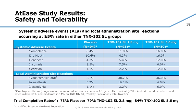 17 © 2018 Tonix Pharmaceuticals Holding Corp AtEase Study Screen Fails versus Inclusion in Individuals with SI/SB • 455 individuals were screened for the AtEase study • 210 of these were screen failed • 11 were screen failed due to SI/SB exclusions • 5 due to MINI Suicidality module score ≥ 17 • 4 due to suicidal behavior in 12 months prior to screening • 2 due to increased suicide risk based on PI judgement • 237 of 245 randomized in AtEase were in the safety population • 76 had experienced lifetime SI • 25 had experienced SI in past 6 months • 29 had lifetime suicidal behaviors • 13 of these individuals had made an actual suicide attempt • Firearm use in 12 of the 29 lifetime suicidal behaviors • 3 preparatory actions – purchasing or loading a gun with intention to kill self • 3 aborted attempts with firearm to head • 2 were interrupted when about to use firearm • 4 attempted suicide with firearm that failed to fire