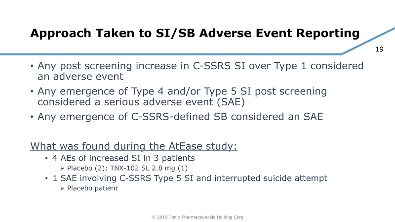 18 © 2018 Tonix Pharmaceuticals Holding Corp AtEase Study Results: Safety and Tolerability Systemic adverse events (AEs) and local administration site reactions occurring at ≥5% rate in either TNX - 102 SL group: Placebo TNX - 102 SL 2.8 mg TNX - 102 SL 5.6 mg Systemic Adverse Events (N=94)* (N=93)* (N=50)* Somnolence 6.4% 11.8% 16.0% Dry Mouth 10.6% 4.3% 16.0% Headache 4.3% 5.4% 12.0% Insomnia 8.5% 7.5% 6.0% Sedation 1.1% 2.2% 12.0% Local Administration Site Reactions Hypoaesthesia oral # 2.1% 38.7% 36.0% Paraesthesia 3.2% 16.1% 4.0% Glossodynia 1.1% 3.2% 6.0% # Oral hypoaesthesia (tongue/mouth numbness) was most common AE, generally transient (<60 minutes), non - dose related and rated mild in 89% and moderate in 11% on TNX - 102 SL; *Safety Population (Total N=237) Trial Completion Rates^: 73% Placebo; 79% TNX - 102 SL 2.8 mg; 84% TNX - 102 SL 5.6 mg ^ modified Intention - to - Treat Population