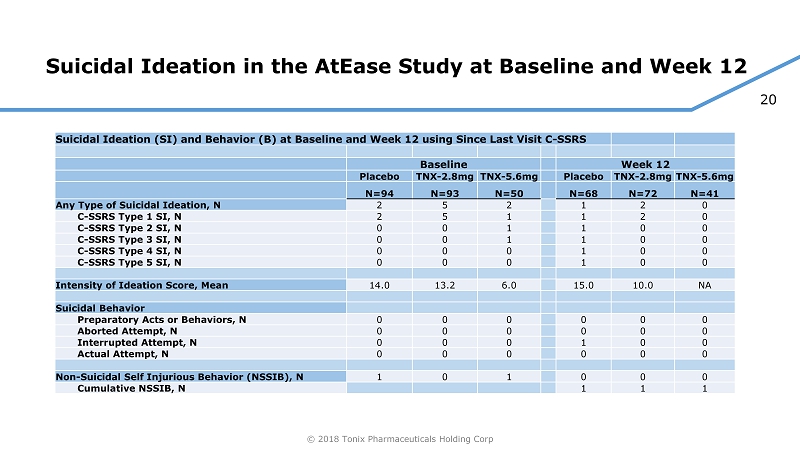 19 © 2018 Tonix Pharmaceuticals Holding Corp Approach Taken to SI/SB Adverse Event Reporting • Any post screening increase in C - SSRS SI over Type 1 considered an adverse event • Any emergence of Type 4 and/or Type 5 SI post screening considered a serious adverse event (SAE) • Any emergence of C - SSRS - defined SB considered an SAE What was found during the AtEase study: • 4 AEs of increased SI in 3 patients » Placebo (2); TNX - 102 SL 2.8 mg (1) • 1 SAE involving C - SSRS Type 5 SI and interrupted suicide attempt » Placebo patient
