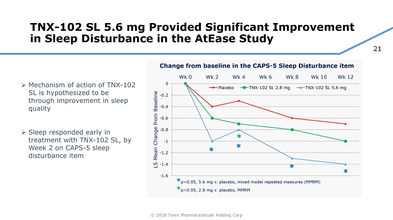 20 © 2018 Tonix Pharmaceuticals Holding Corp Suicidal Ideation in the AtEase Study at Baseline and Week 12 Suicidal Ideation (SI) and Behavior (B) at Baseline and Week 12 using Since Last Visit C - SSRS Baseline Week 12 Placebo TNX - 2.8mg TNX - 5.6mg Placebo TNX - 2.8mg TNX - 5.6mg N=94 N=93 N=50 N=68 N=72 N=41 Any Type of Suicidal Ideation, N 2 5 2 1 2 0 C - SSRS Type 1 SI, N 2 5 1 1 2 0 C - SSRS Type 2 SI, N 0 0 1 1 0 0 C - SSRS Type 3 SI, N 0 0 1 1 0 0 C - SSRS Type 4 SI, N 0 0 0 1 0 0 C - SSRS Type 5 SI, N 0 0 0 1 0 0 Intensity of Ideation Score, Mean 14.0 13.2 6.0 15.0 10.0 NA Suicidal Behavior Preparatory Acts or Behaviors, N 0 0 0 0 0 0 Aborted Attempt, N 0 0 0 0 0 0 Interrupted Attempt, N 0 0 0 1 0 0 Actual Attempt, N 0 0 0 0 0 0 Non - Suicidal Self Injurious Behavior (NSSIB), N 1 0 1 0 0 0 Cumulative NSSIB, N 1 1 1