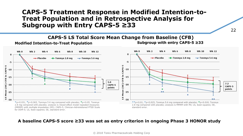 21 © 2018 Tonix Pharmaceuticals Holding Corp TNX - 102 SL 5.6 mg Provided Significant Improvement in Sleep Disturbance in the AtEase Study » Mechanism of action of TNX - 102 SL is hypothesized to be through improvement in sleep quality » Sleep responded early in treatment with TNX - 102 SL, by Week 2 on CAPS - 5 sleep disturbance item