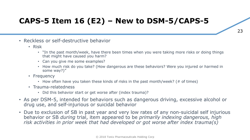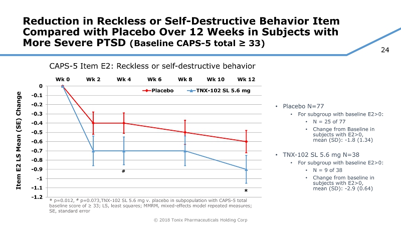 23 © 2018 Tonix Pharmaceuticals Holding Corp CAPS - 5 Item 16 (E2) – New to DSM - 5/CAPS - 5 • Reckless or self - destructive behavior • Risk • “In the past month/week, have there been times when you were taking more risks or doing things that might have caused you harm? • Can you give me some examples? • How much risk do you take? (How dangerous are these behaviors? Were you injured or harmed in some way?)” • Frequency • How often have you taken these kinds of risks in the past month /week? (# of times) • Trauma - relatedness • Did this behavior start or get worse after (index trauma)? • As per DSM - 5, intended for behaviors such as dangerous driving, excessive alcohol or drug use, and self - injurious or suicidal behavior • Due to exclusion of SB in past year and very low rates of any non - suicidal self injurious behavior or SB during trial, item appeared to be primarily indexing dangerous, high risk activities in prior week that had developed or got worse after index trauma(s)