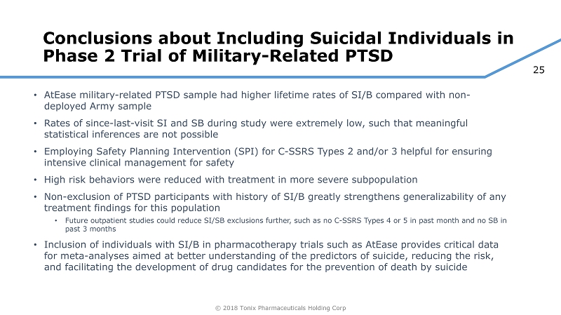 24 © 2018 Tonix Pharmaceuticals Holding Corp Reduction in Reckless or Self - Destructive Behavior Item Compared with Placebo Over 12 Weeks in Subjects with More Severe PTSD (Baseline CAPS - 5 total ≥ 33) • Placebo N=77 • For subgroup with baseline E2>0: • N = 25 of 77 • Change from Baseline in subjects with E2>0, mean (SD): - 1.8 (1.34) • TNX - 102 SL 5.6 mg N=38 • For subgroup with baseline E2>0: • N = 9 of 38 • Change from baseline in subjects with E2>0, mean (SD): - 2.9 (0.64) -1.2 -1.1 -1 -0.9 -0.8 -0.7 -0.6 -0.5 -0.4 -0.3 -0.2 -0.1 0 Wk 0 Wk 2 Wk 4 Wk 6 Wk 8 Wk 10 Wk 12 Item E2 LS Mean (SE) Change Placebo TNX-102 SL 5.6 mg # * p=0.012, # p=0.073, TNX - 102 SL 5.6 mg v. placebo in subpopulation with CAPS - 5 total baseline score of ≥ 33; LS, least squares; MMRM, mixed - effects model repeated measures; SE, standard error * CAPS - 5 Item E2: Reckless or self - destructive behavior