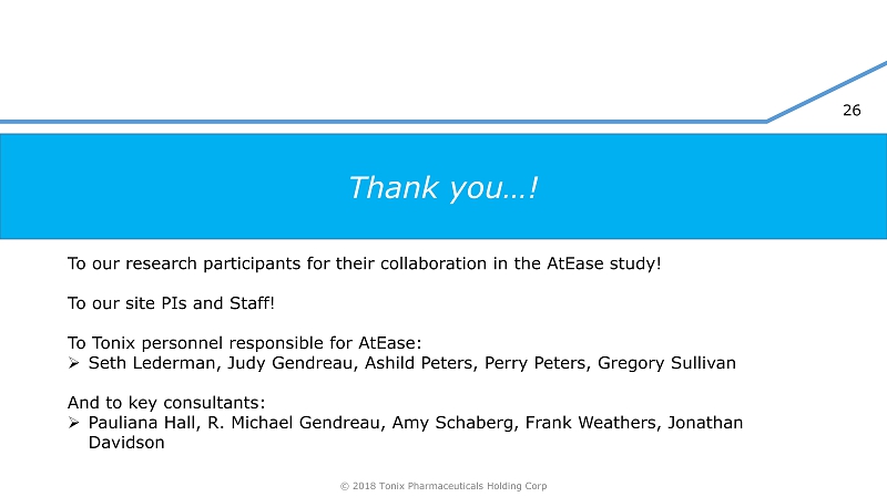 26 Thank you…! © 2018 Tonix Pharmaceuticals Holding Corp To our research participants for their collaboration in the AtEase study! To our site PIs and Staff! To Tonix personnel responsible for AtEase : » Seth Lederman, Judy Gendreau, Ashild Peters, Perry Peters, Gregory Sullivan And to key consultants: » Pauliana Hall, R. Michael Gendreau, Amy Schaberg , Frank Weathers, Jonathan Davidson