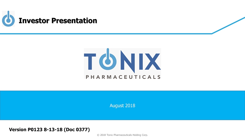 © 2018 Tonix Pharmaceuticals Holding Corp. August 2018 Version P0123 8 - 13 - 18 (Doc 0377) Investor Presentation
