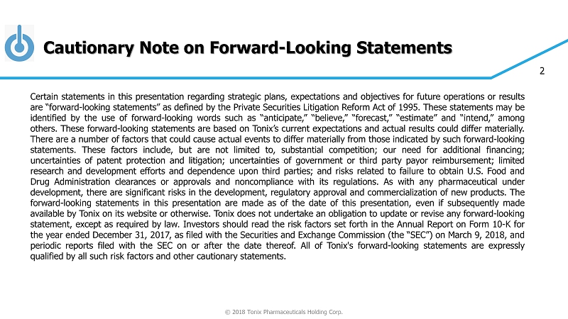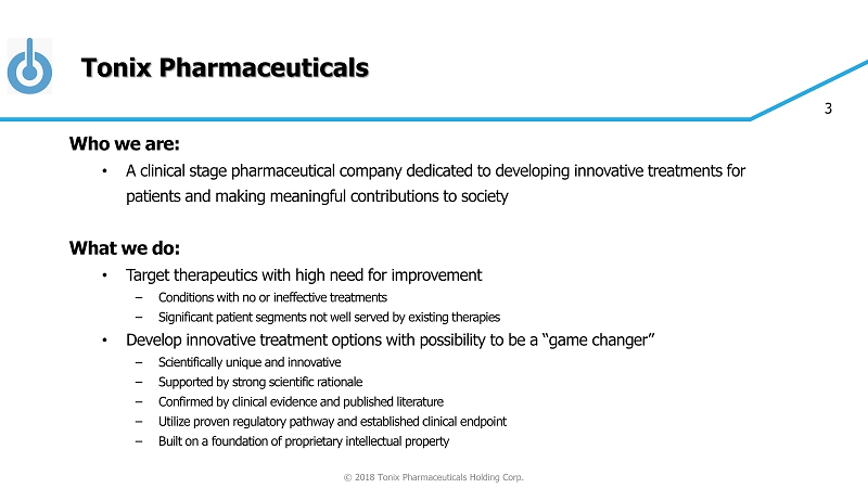 © 2018 Tonix Pharmaceuticals Holding Corp. 2 Cautionary Note on Forward - Looking Statements Certain statements in this presentation regarding strategic plans, expectations and objectives for future operations or results are “forward - looking statements” as defined by the Private Securities Litigation Reform Act of 1995 . These statements may be identified by the use of forward - looking words such as “anticipate,” “believe,” “forecast,” “estimate” and “intend,” among others . These forward - looking statements are based on Tonix’s current expectations and actual results could differ materially . There are a number of factors that could cause actual events to differ materially from those indicated by such forward - looking statements . These factors include, but are not limited to, substantial competition ; our need for additional financing ; uncertainties of patent protection and litigation ; uncertainties of government or third party payor reimbursement ; limited research and development efforts and dependence upon third parties ; and risks related to failure to obtain U . S . Food and Drug Administration clearances or approvals and noncompliance with its regulations . As with any pharmaceutical under development, there are significant risks in the development, regulatory approval and commercialization of new products . The forward - looking statements in this presentation are made as of the date of this presentation, even if subsequently made available by Tonix on its website or otherwise . Tonix does not undertake an obligation to update or revise any forward - looking statement, except as required by law . Investors should read the risk factors set forth in the Annual Report on Form 10 - K for the year ended December 31 , 2017 , as filed with the Securities and Exchange Commission (the “SEC”) on March 9 , 2018 , and periodic reports filed with the SEC on or after the date thereof . All of Tonix's forward - looking statements are expressly qualified by all such risk factors and other cautionary statements .