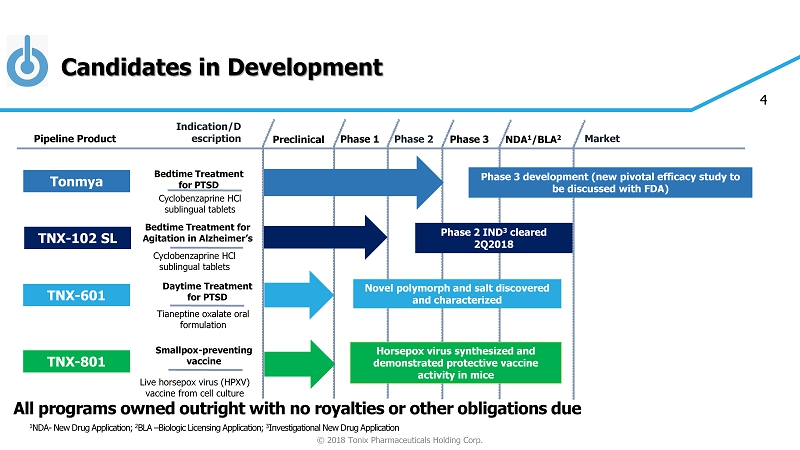 © 2018 Tonix Pharmaceuticals Holding Corp. 3 Tonix Pharmaceuticals Who we are: • A clinical stage pharmaceutical company dedicated to developing innovative treatments for patients and making meaningful contributions to society What we do: • Target therapeutics with high need for improvement − Conditions with no or ineffective treatments − Significant patient segments not well served by existing therapies • Develop innovative treatment options with possibility to be a “game changer” − Scientifically unique and innovative − Supported by strong scientific rationale − Confirmed by clinical evidence and published literature − Utilize proven regulatory pathway and established clinical endpoint − Built on a foundation of proprietary intellectual property