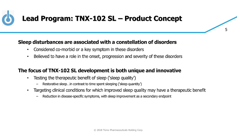 © 2018 Tonix Pharmaceuticals Holding Corp. 4 Candidates in Development Preclinical Phase 2 NDA 1 /BLA 2 Market Pipeline Product Indication/D escription Phase 3 Tonmya Bedtime Treatment for PTSD Daytime Treatment for PTSD TNX - 601 Novel polymorph and salt discovered and characterized TNX - 801 Horsepox virus synthesized and demonstrated protective vaccine activity in mice Smallpox - preventing vaccine Cyclobenzaprine HCl sublingual tablets Tianeptine oxalate oral formulation Live horsepox virus (HPXV) vaccine from cell culture Phase 1 1 NDA - New Drug Application; 2 BLA – Biologic Licensing Application; 3 Investigational New Drug Application Bedtime Treatment for Agitation in Alzheimer’s Cyclobenzaprine HCl sublingual tablets Phase 2 IND 3 cleared 2Q2018 TNX - 102 SL All programs owned outright with no royalties or other obligations due Phase 3 development (new pivotal efficacy study to be discussed with FDA)