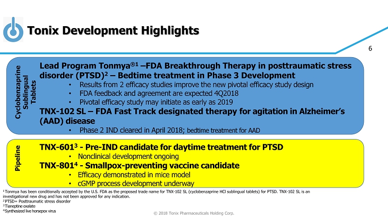 © 2018 Tonix Pharmaceuticals Holding Corp. 5 Lead Program: TNX - 102 SL – Product Concept Sleep disturbances are associated with a constellation of disorders • Considered co - morbid or a key symptom in these disorders • Believed to have a role in the onset, progression and severity of these disorders The focus of TNX - 102 SL development is both unique and innovative • Testing the therapeutic benefit of sleep (‘sleep quality’) − Restorative sleep…in contrast to time spent sleeping (‘sleep quantity’) • Targeting clinical conditions for which improved sleep quality may have a therapeutic benefit − Reduction in disease - specific symptoms, with sleep improvement as a secondary endpoint