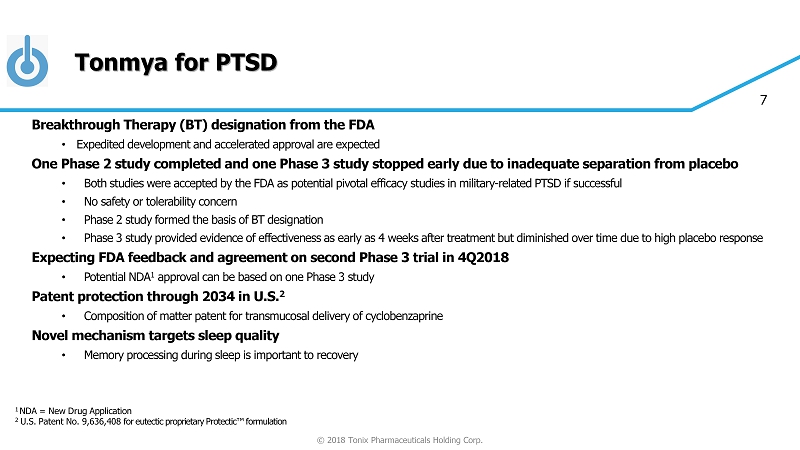 © 2018 Tonix Pharmaceuticals Holding Corp. 6 Lead Program Tonmya ®1 – FDA Breakthrough Therapy in posttraumatic stress disorder (PTSD) 2 – Bedtime treatment in Phase 3 Development • Results from 2 efficacy studies improve the new pivotal efficacy study design • FDA feedback and agreement are expected 4Q2018 • Pivotal efficacy study may initiate as early as 2019 TNX - 102 SL – FDA Fast Track designated therapy for agitation in Alzheimer’s (AAD) disease • Phase 2 IND cleared in April 2018; bedtime treatment for AAD TNX - 601 3 - Pre - IND candidate for daytime treatment for PTSD • Nonclinical development ongoing TNX - 801 4 - Smallpox - preventing vaccine candidate • Efficacy demonstrated in mice model • cGMP process development underway 1 Tonmya has been conditionally accepted by the U.S. FDA as the proposed trade name for TNX - 102 SL (cyclobenzaprine HCl sublingual tablets) for PTSD. TNX - 102 SL is an investigational new drug and has not been approved for any indication. 2 PTSD= Posttraumatic stress disorder 3 T ianeptine oxalate 4 S ynthesized live horsepox virus Tonix Development Highlights Cyclobenzaprine Sublingual Tablets Pipeline