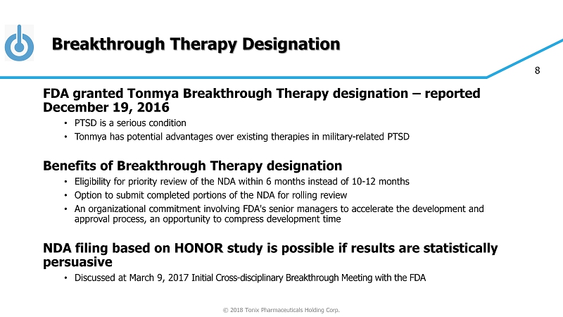 © 2018 Tonix Pharmaceuticals Holding Corp. 7 Tonmya for PTSD Breakthrough Therapy (BT) designation from the FDA • Expedited development and accelerated approval are expected One Phase 2 study completed and one Phase 3 study stopped early due to inadequate separation from placebo • Both studies were accepted by the FDA as potential pivotal efficacy studies in military - related PTSD if successful • No safety or tolerability concern • Phase 2 study formed the basis of BT designation • Phase 3 study provided evidence of effectiveness as early as 4 weeks after treatment but diminished over time due to high pla ceb o response Expecting FDA feedback and agreement on second Phase 3 trial in 4Q2018 • Potential NDA 1 approval can be based on one Phase 3 study Patent protection through 2034 in U.S. 2 • Composition of matter patent for transmucosal delivery of cyclobenzaprine Novel mechanism targets sleep quality • Memory processing during sleep is important to recovery 1 NDA = New Drug Application 2 U .S. Patent No. 9,636,408 for eutectic proprietary Protectic ™ formulation