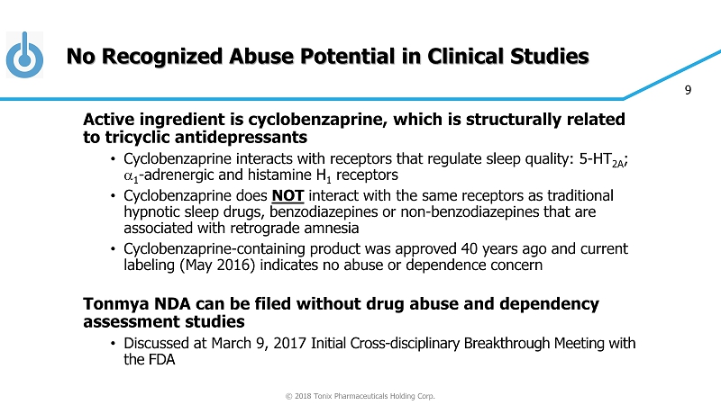 © 2018 Tonix Pharmaceuticals Holding Corp. 9 No Recognized Abuse Potential in Clinical Studies Active ingredient is cyclobenzaprine, which is structurally related to tricyclic antidepressants • Cyclobenzaprine interacts with receptors that regulate sleep quality: 5 - HT 2A ; a 1 - adrenergic and histamine H 1 receptors • Cyclobenzaprine does NOT interact with the same receptors as traditional hypnotic sleep drugs, benzodiazepines or non - benzodiazepines that are associated with retrograde amnesia • Cyclobenzaprine - containing product was approved 40 years ago and current labeling (May 2016) indicates no abuse or dependence concern Tonmya NDA can be filed without drug abuse and dependency assessment studies • Discussed at March 9, 2017 Initial Cross - disciplinary Breakthrough Meeting with the FDA