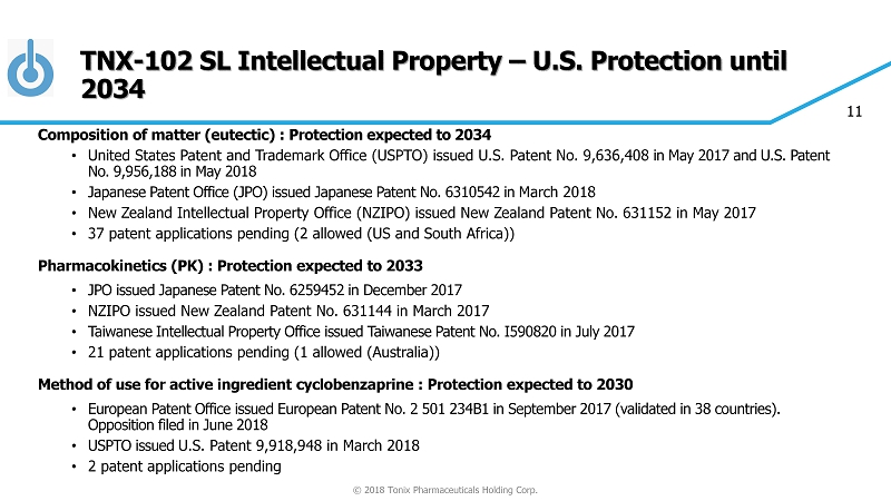 © 2018 Tonix Pharmaceuticals Holding Corp. 10 No Recognized Abuse Potential in Clinical Studies Active ingredient is cyclobenzaprine, which is structurally related to tricyclic antidepressants • Cyclobenzaprine interacts with receptors that regulate sleep quality: 5 - HT 2A ; a 1 - adrenergic and histamine H 1 receptors • Cyclobenzaprine does NOT interact with the same receptors as traditional hypnotic sleep drugs, benzodiazepines or non - benzodiazepines that are associated with retrograde amnesia • Cyclobenzaprine - containing product was approved 40 years ago and current labeling (May 2016) indicates no abuse or dependence concern Tonmya NDA can be filed without drug abuse and dependency assessment studies • Discussed at March 9, 2017 Initial Cross - disciplinary Breakthrough Meeting with the FDA